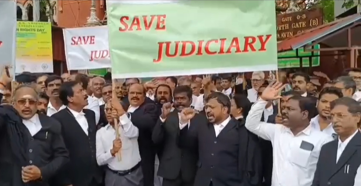 Today in chennai Tamilnadu high court entrance a huge group of judges doing protest against ruling DMK party, with the sign board in hands SAVE JUDICIARY. This is the issue started from Thiruparam kundam lighting jothi in the hill top, regarding a Hindu festival judgment given by JUSTICE G R Swaminathan.