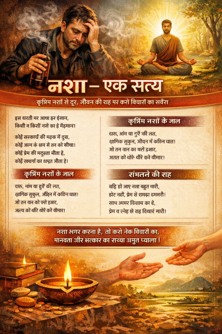 नशा – एक सत्य भूमिका मनुष्य का जीवन केवल शारीरिक अस्तित्व नहीं, बल्कि भावनाओं, विचारों और अनुभवों का समन्वय है।