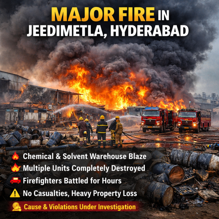 1. Major Fire in Jeedimetla Industrial Area Location: • Ram Reddy Nagar, Jeedimetla Industrial Area (outskirts of Hyderabad) What Happened: