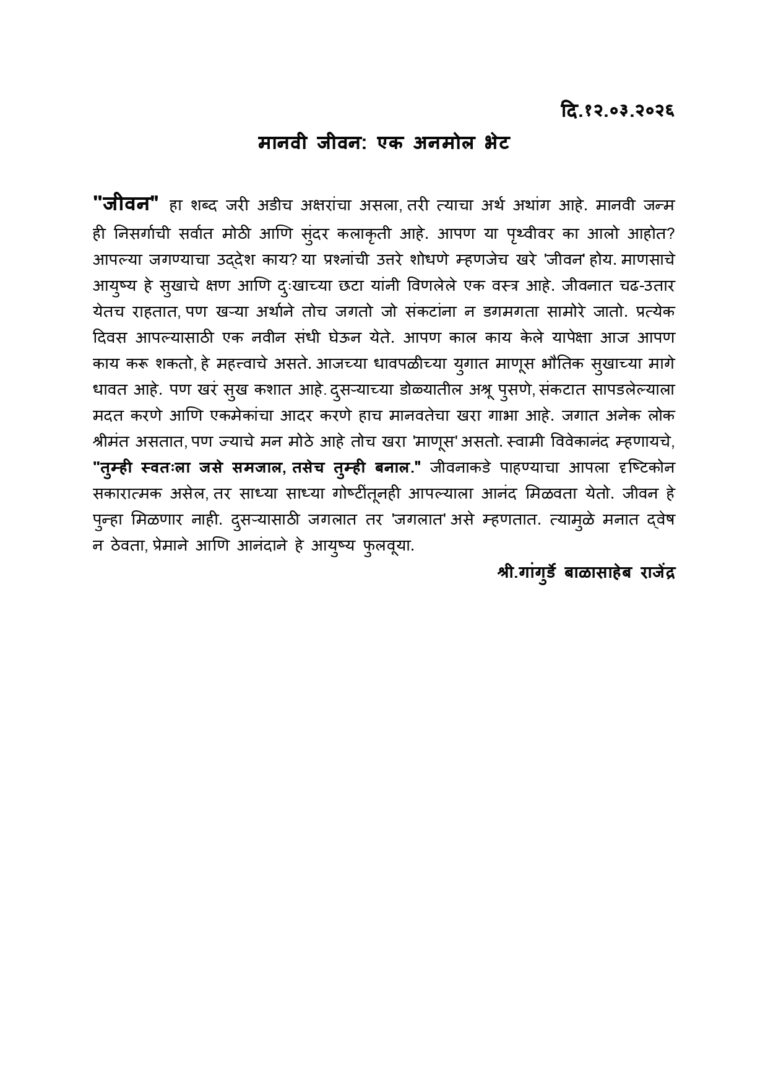 दि.१२.०३.२०२६ मानवी जीवन: एक अनमोल भेट “जीवन” हा शब्द जरी अडीच अक्षरांचा असला, तरी त्याचा अर्थ अथांग आहे. मानवी जन्म