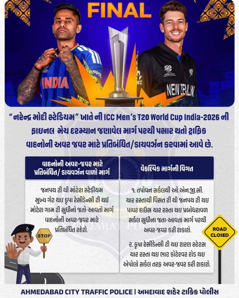 અમદાવાદમાં T20 વર્લ્ડ કપ ફાઇનલને પગલે ટ્રાફિક વ્યવસ્થામાં ફેરફાર અમદાવાદના નરેન્દ્ર મોદી સ્ટેડિયમ ખાતે યોજાનારી ICC Men’s T20 World Cup