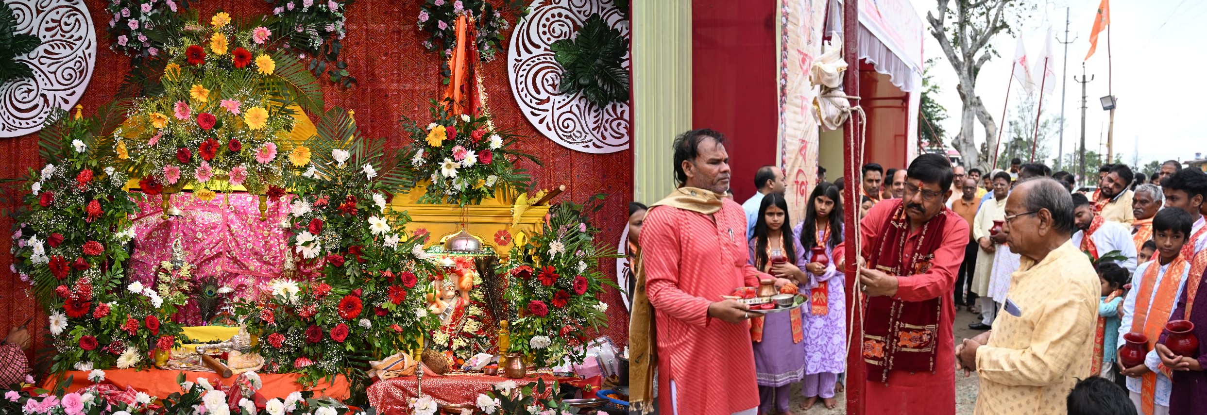 जलाभिषेक किया। इसके बाद श्री हनुमान जन्मोत्सव पालन समिति के अध्यक्ष विनोद कुमार जालान ने ठाकुरबाड़ी के प्रांगण में ध्वजारोहण कर कार्यक्रमों का श्रीगणेश किया। इस दौरान अध्यक्ष के साथ अन्य विशिष्ट व्यक्तियों का दुपट्टा पहनाकर अभिनंदन किया गया। तत्पश्चात विशिष्ट समाजसेवीद्वय क्रमशः रामलाल मोर और देवी प्रसाद चौधरी ने श्री गणेश जी महाराज और श्री हनुमान जी महाराज की प्रतिमा के समक्ष दीप प्रज्ज्वलित किया। इससे पहले आयोजन समिति की ओर से दोनों उद्घाटनकर्ताओं का दुपट्टा पहनाकर अभिनंदन किया गया। कार्यक्रम का संचालन आयोजक समिति के कार्यकारी अध्यक्ष अरुण मोर ने किया।