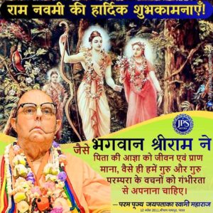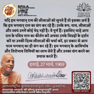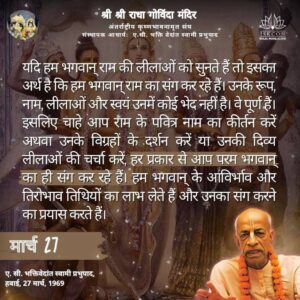 यदि हम भगवान् राम की लीलाओं को सुनते हैं तो इसका अर्थ है कि हम भगवान् राम का संग कर रहे हैं। उनके रूप, नाम, लीलाओं और स्वयं उनमें कोई भेद नहीं है। वे पूर्ण हैं। इसलिए चाहे आप राम के पवित्र नाम का कीर्तन करें अथवा उनके विग्रहों के दर्शन करें या उनकी दिव्य लीलाओं की चर्चा करें, हर प्रकार से आप परम भगवान् का ही संग कर रहे हैं। हम भगवान् के आविर्भाव और तिरोभाव तिथियों का लाभ लेते हैं और उनका संग करने का प्रयास करते हैं।