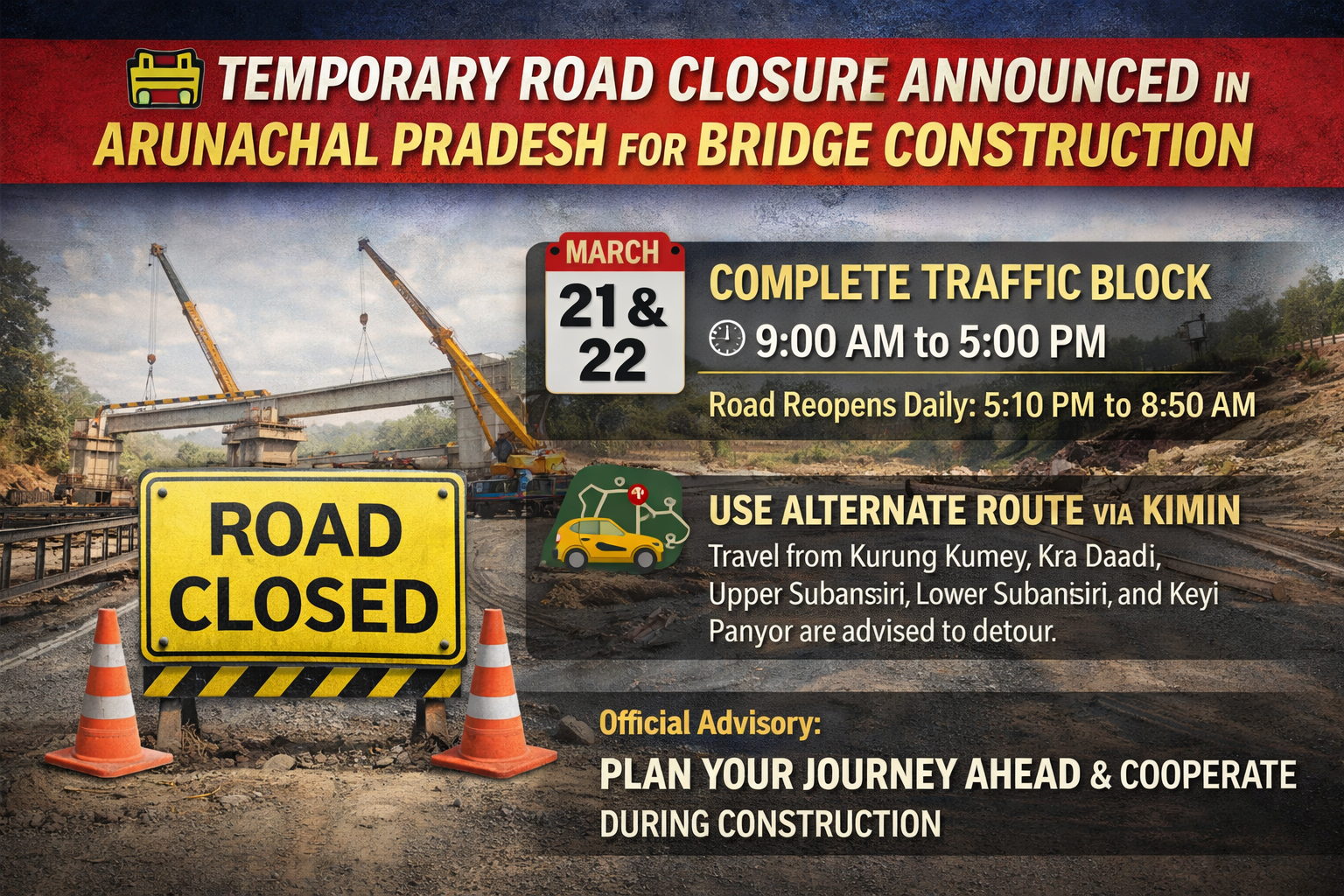 The road will remain closed on March 21 and 22 to facilitate crucial bridge construction activities. Officials stated that heavy machinery, including cranes, will be used to install RCC girders, requiring full occupation of both lanes and making traffic movement unsafe during this period.